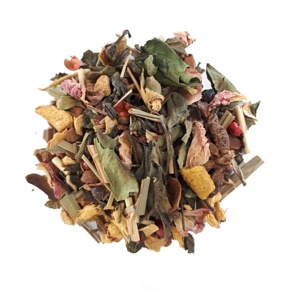 Bâtons de cannelle*, gingembre*, thé vert China Chun Mee*, anis*, citronnelle*, Pai Mu Tan*, fève de cacao concassée*, curcuma*, poivre noir*, écorces de cacao*, badiane*, poivre rose*, clous de girofle*, thé blanc Mao Feng*, pétales de rose*, cardamome*,, Bâtons de cannelle*, gingembre*, thé vert China Chun Mee*, anis*, citronnelle*, Pai Mu Tan*, fève de cacao concassée*, curcuma*, poivre noir*, écorces de cacao*, badiane*, poivre rose*, clous de girofle*, thé blanc Mao Feng*, pétales de rose*, cardamome*,